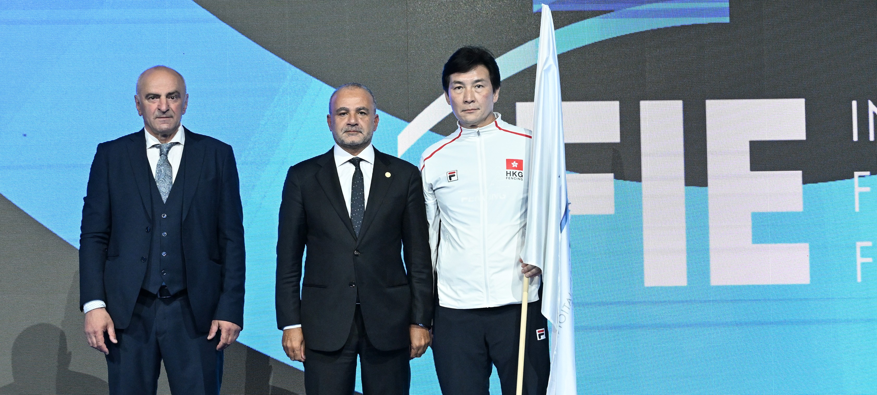 The Closing Ceremony concluded with the FIE flag being officially passed from the Georgian Fencing Federation to Mr. Zheng Kang Zhao of the Hong Kong, China Fencing Association for the 2026 Fencing World Championships.