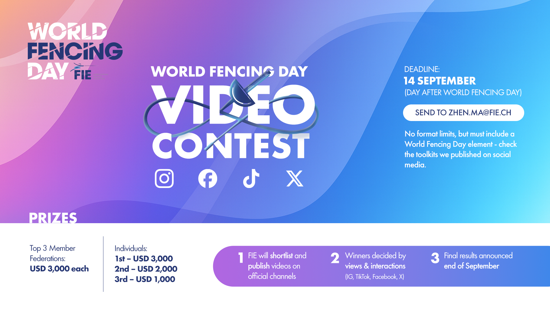 The FIE World Fencing Day video contest is open to both individuals and FIE member federations. Share video fencing stories by sending them to the FIE (see contact information, below) and the top three individual entries will win U.S. $3000 for first place, with $2000 and $1000 awarded to second and third places, and the top three federation videos will receive $3000 each.