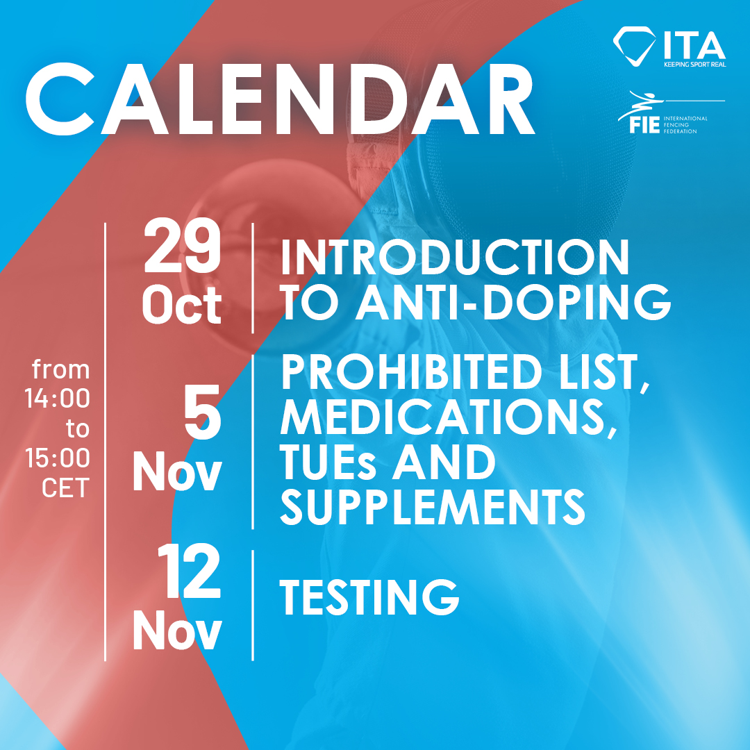LAUSANNE, Switz., Oct. 16, 2025 – The FIE and International Testing Agency (ITA) will host a series of three Clean Sport and Antidoping webinars on October 29 and Nov. 5 and 12. The series is open to all athletes, coaches and officials who would like to learn more about this important aspect of competition.