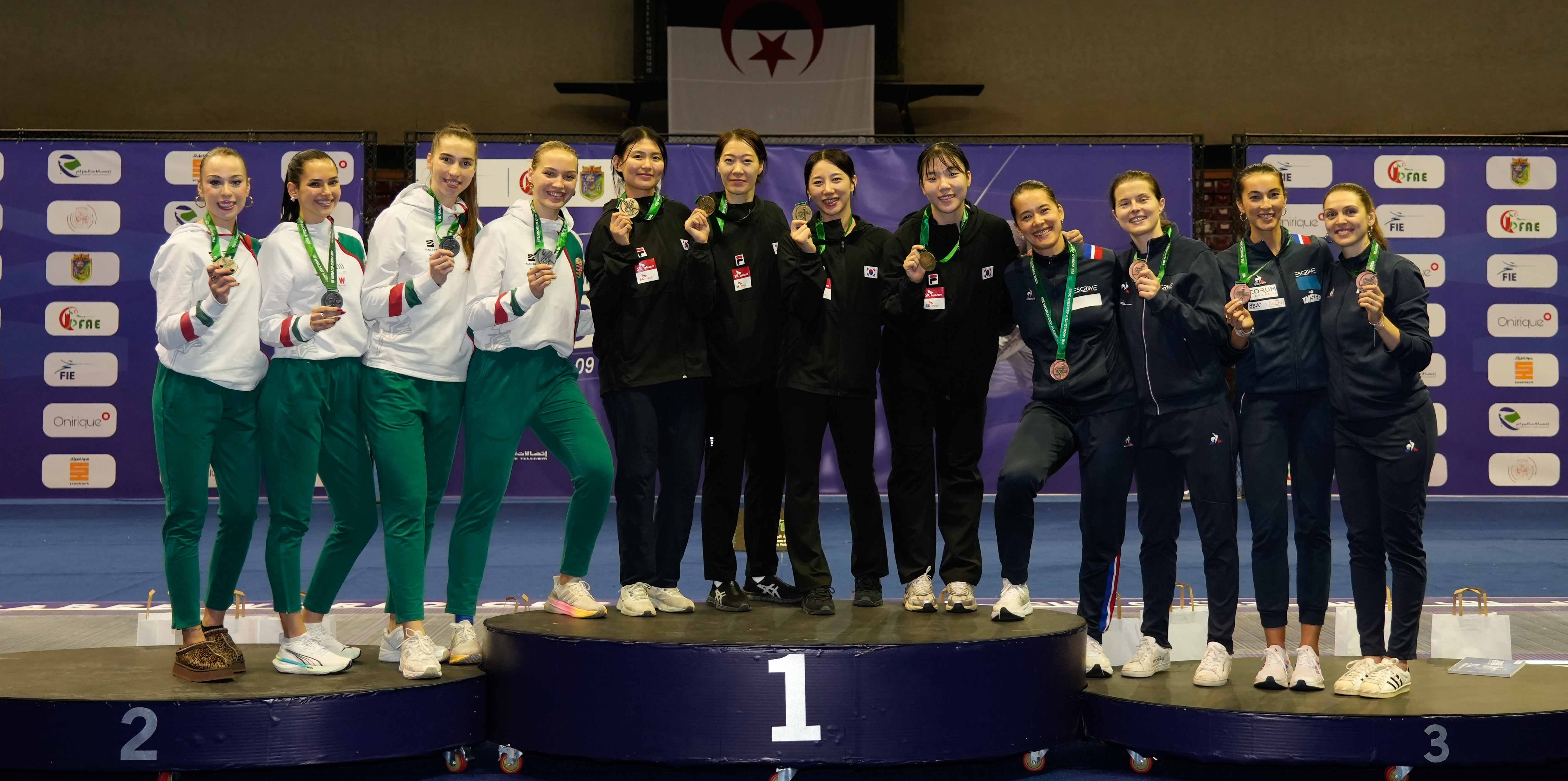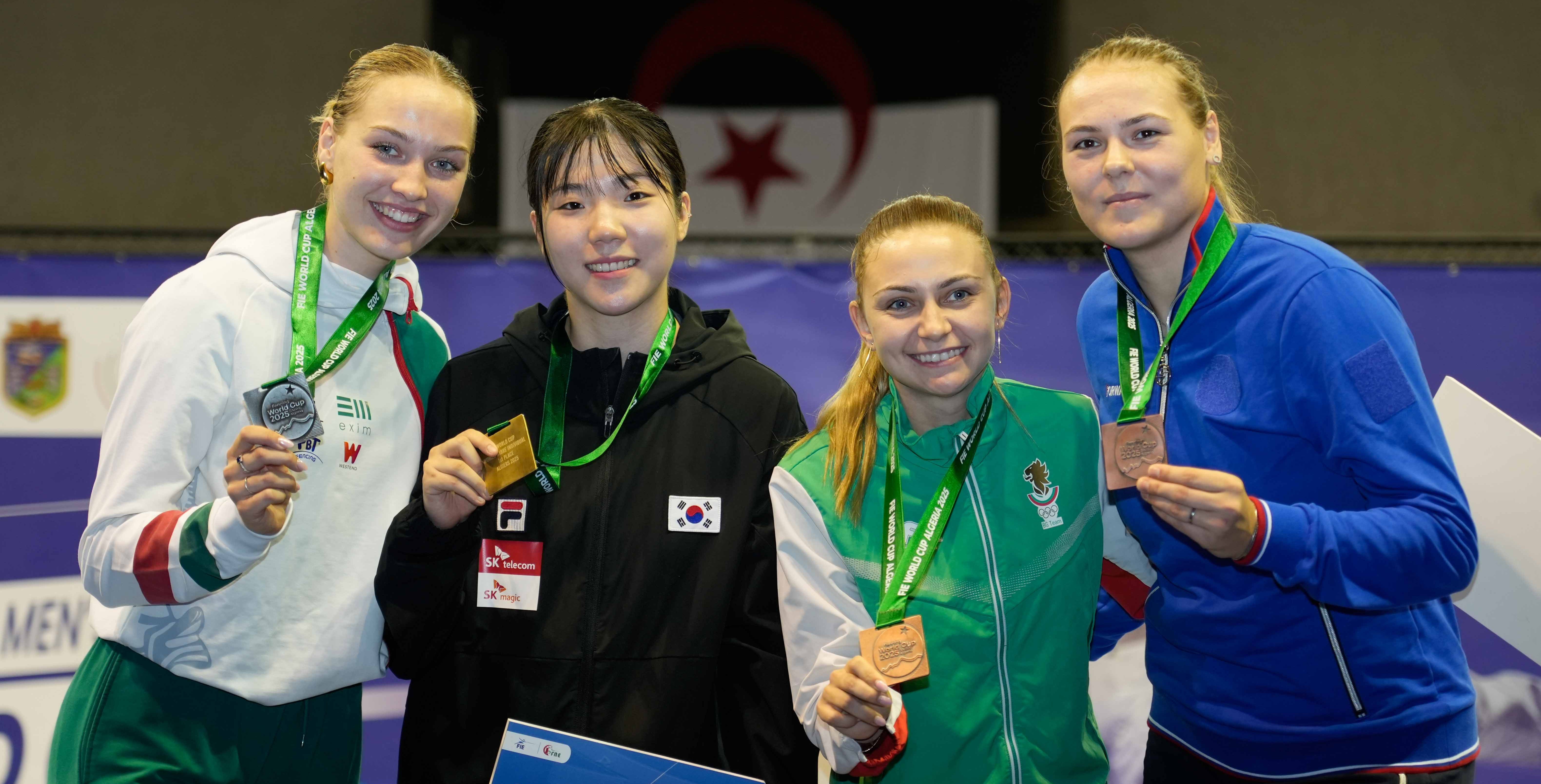 Final results in women’s individual sabre included Hayoung Jeon (KOR, gold), Sugar Katinka Battai (HUN, silver), Alina Mikhailova (_AIN, bronze), Yoana Ilieva (BUL, bronze), Despina Georgiadou (GRE), Lucia Martin-Portugues (ESP), Nisanur Erbil (TÜR) and Olga Nikitina (_AIN).