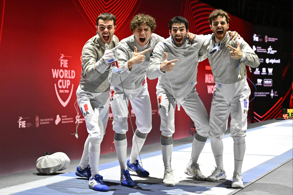 France topped a field of twenty-four teams at the Budapest, Hungary World Cup, defeating Romania 45–34 to take the men’s team sabre gold.